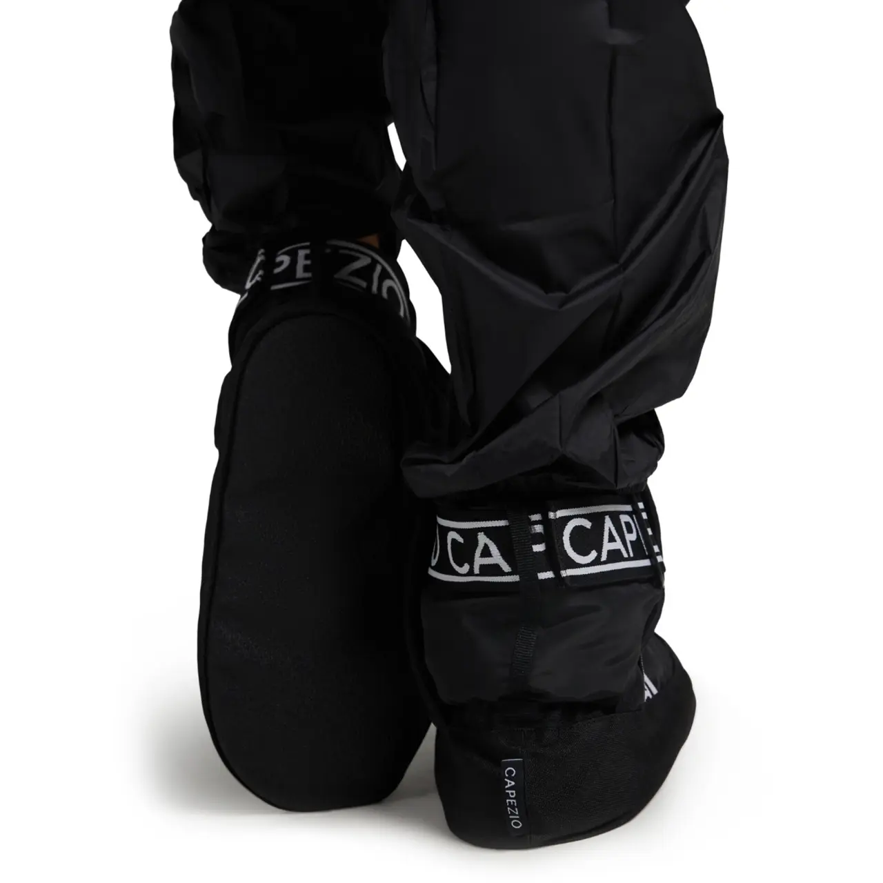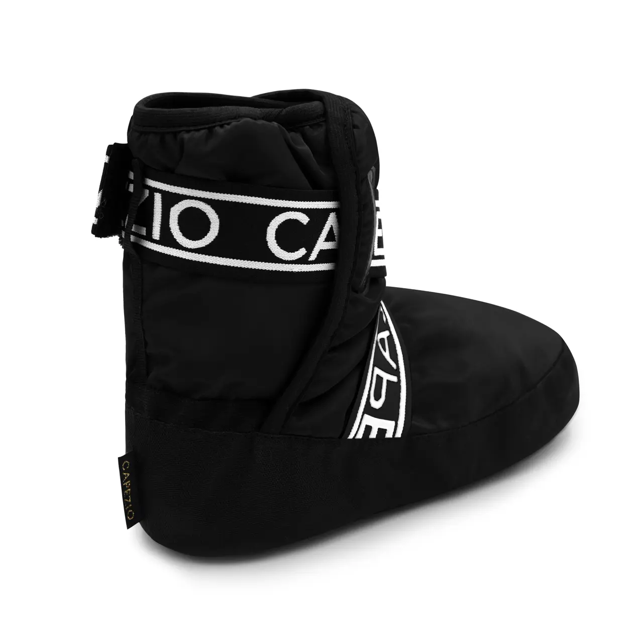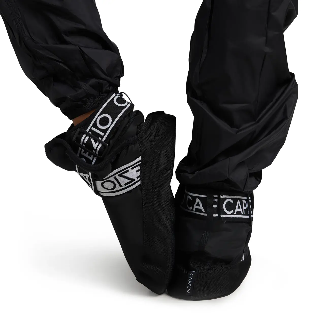 Talpa antiderapantă, moale și căptușită asigură un contact stabil cu solul și o distribuție uniformă a greutății, ceea ce le face ideale pentru mișcarea în sala de dans. Materialul exterior din poliester taffeta, combinat cu o umplutură moale din poliester, oferă o izolație termică plăcută fără a limita libertatea de mișcare. Benzile elastice, reglabile, cu logo Capezio din jurul gleznei garantează o fixare sigură, confortabilă și adaptată individual.