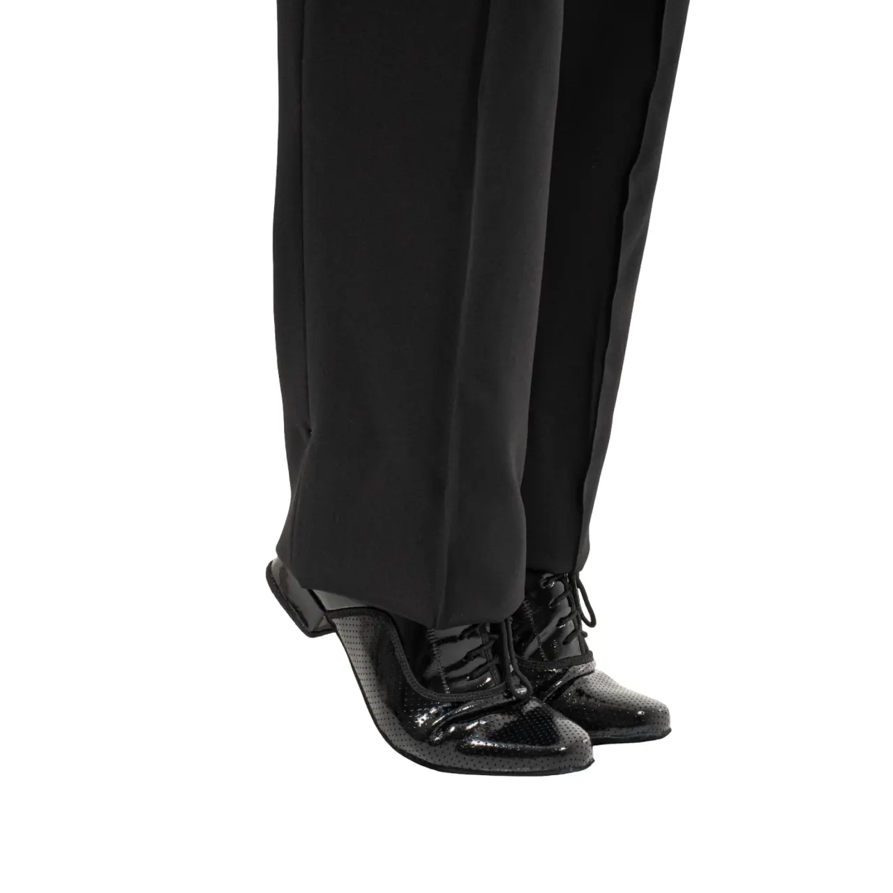Partea superioară este realizată din piele lăcuită (patent), care conferă pantofilor un luciu luxos. Partea din față este fin perforată, creând un detaliu interesant și evidențiind caracterul elegant al încălțămintei, în timp ce restul zonelor sunt realizate din material lăcuit neted, pentru un aspect curat și atemporal.