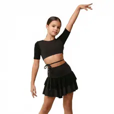 Materialul elastic din micropoliamidă se adaptează ușor corpului, își păstrează forma și oferă libertate maximă la dans. Elementele decorative conferă topului o textură unică și evidențiază liniile umerilor și taliei, creând un efect vizual impresionant atât la antrenament, cât și pe scenă.