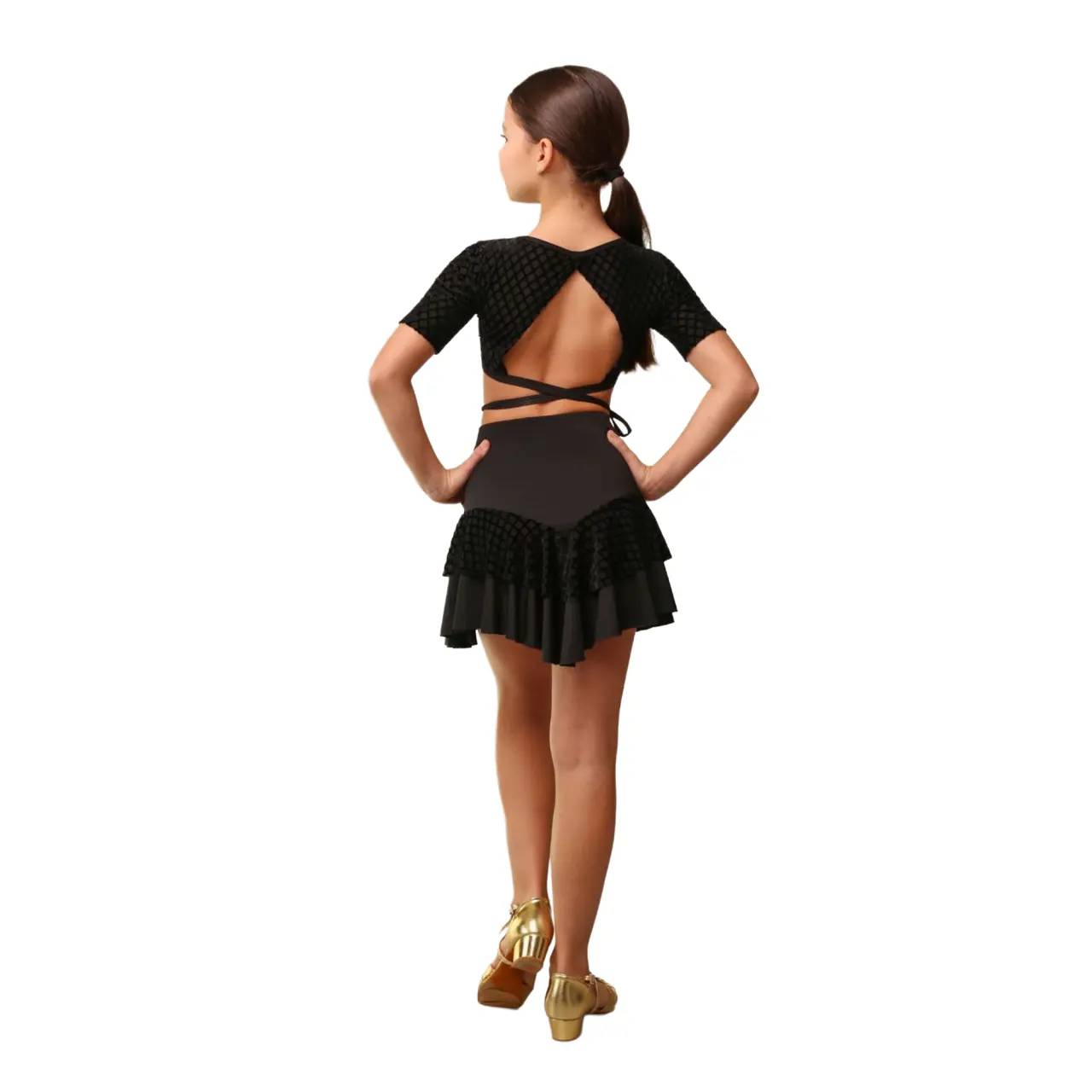 Topul de dans pentru fete Iona din colecția MINI NOIR se remarcă prin designul elegant destinat dansurilor latino. Spatele deschis accentuat, în combinație cu prinderea reglabilă, permite ajustarea după nevoie și, în același timp, rămâne fix în timpul mișcării.