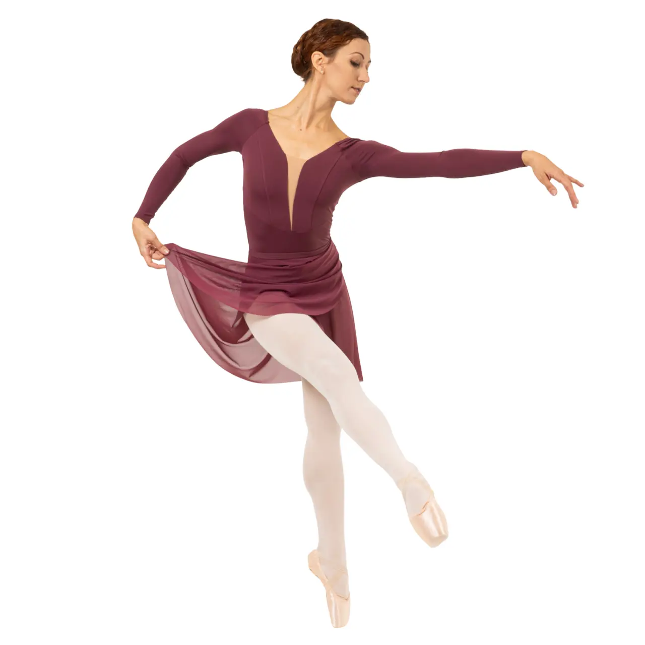 Le Secret Danica este un costum elegant, conceput în principal pentru balet și dans clasic. În partea din față atrage atenția decolteul în formă de V cu inserție triunghiulară, care oferă un aspect delicat și alungește linia gâtului. Croiul empire, combinat cu cusăturile de tip prințesă, conturează frumos silueta și evidențiază forma feminină.